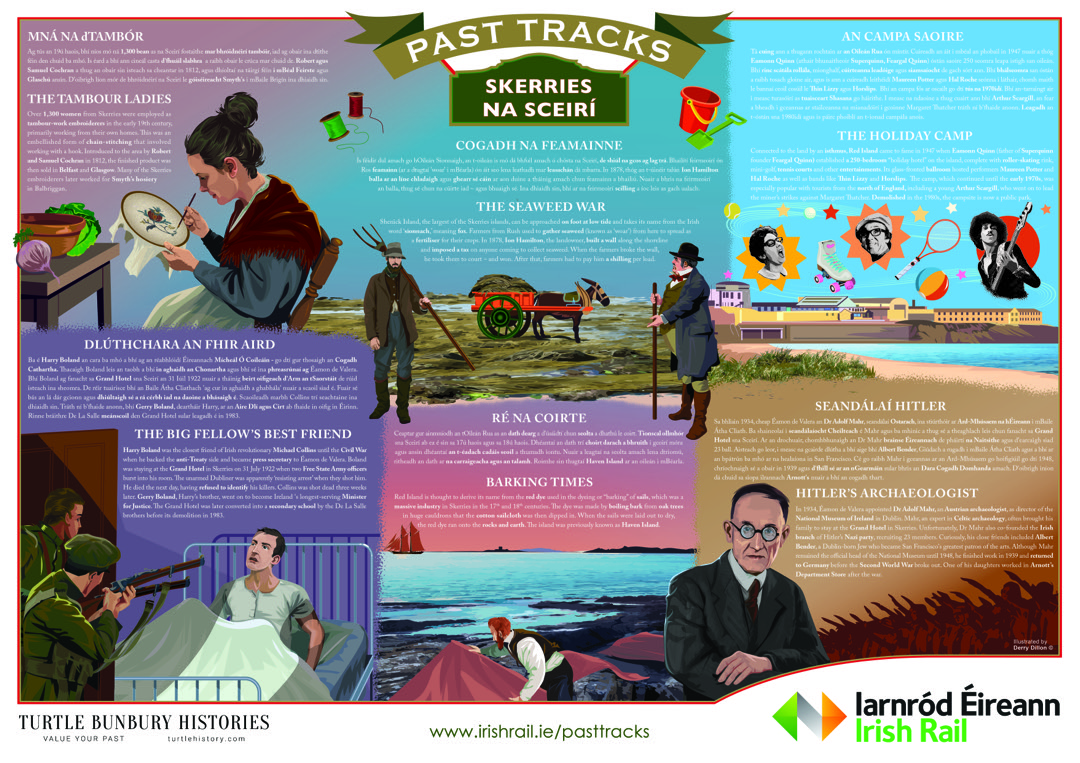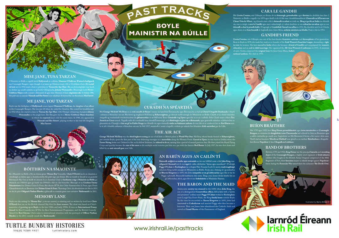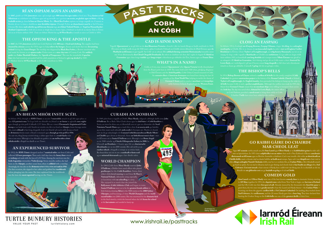 Written and researched by Turtle, and illustrated by Derry Dillon, the ‘Past Tracks’ panels offer snapshots of history about lesser-known people, places and events connected with Ireland’s rich past. Samples can be viewed here.