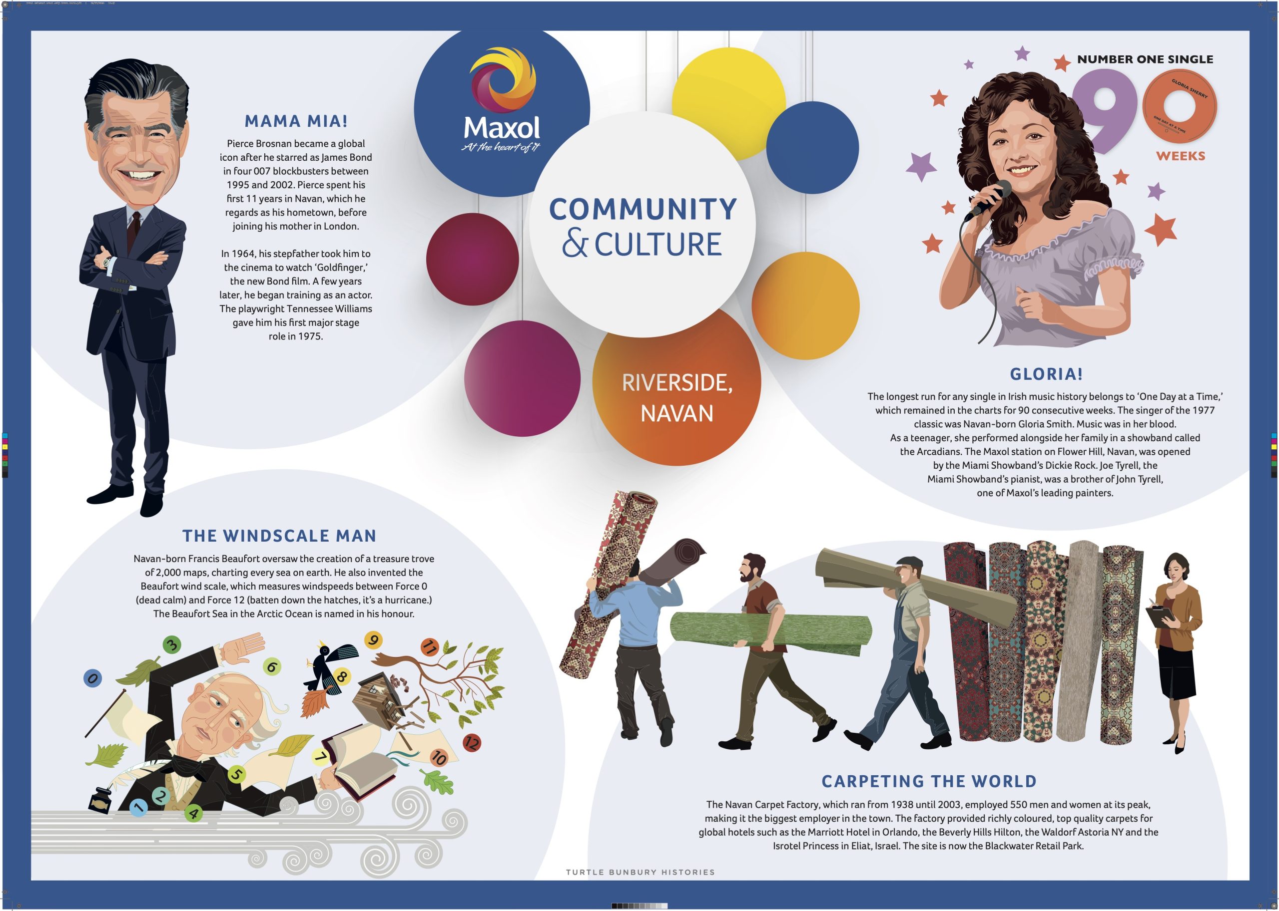 In 2023, Turtle teamed up with illustrator Derry Dillon to produce history panels for the Maxol service stations in Turvey, Kinnegar, Kilkenny, Navan and Portrush. Each panel tells 4 or 5 short stories about the locality, aimed at enlightening the reader while they wait.