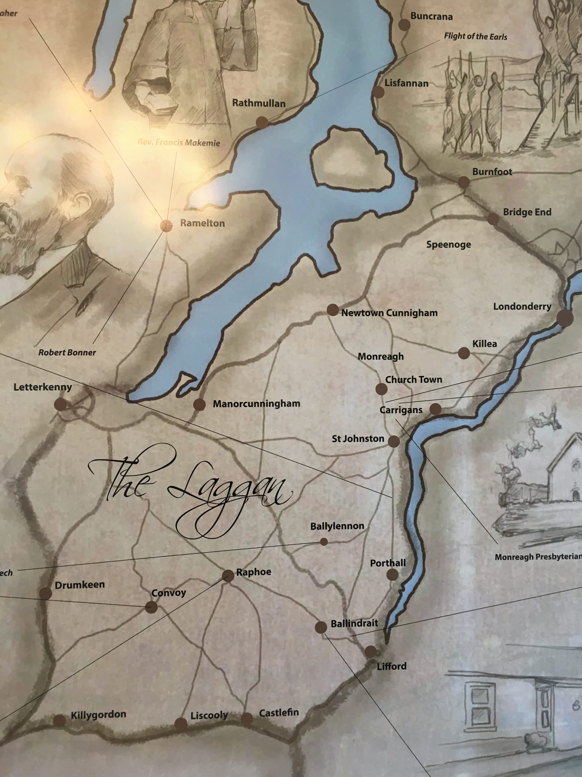 In June 2021, I visited Monreagh Ulster Scots – Scots Irish Heritage Centre, in The Old Manse, Carrigans (www.monreagh.net) where I met with the charming and very knowledgeable Kieran Fagan. The centre itself is intelligently laid out with much of interest to historical souls.
