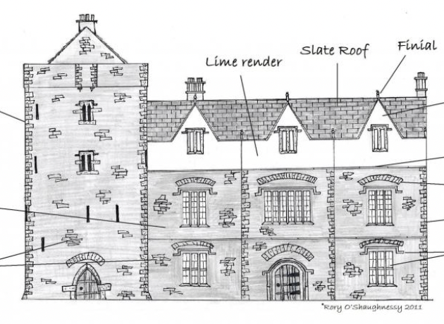 16th century towerhouse with fortified dwelling extension, by Rory O’Shaugnessy, 2011. Sylvia wonders if the original Trintaugh House might have looked a little like this?