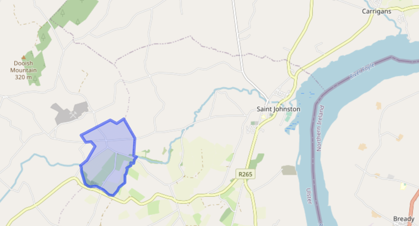 The first known home of the McClintocks in Ireland was a farm at Trintaugh (aka Trentagh, Trenta, Tryentagh etc) in County Donegal. The 250-acre (101-hectare) townland is located near the River Foyle, 2-3 miles WSW of St Johnstown (and SW of Derry) in the Laggan Valley, the most fertile land in that part of Ireland. [1] It shows up on Google maps at about this point, or on townland.ie here.