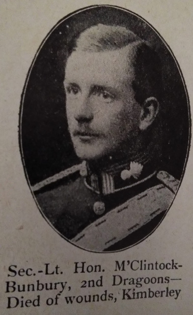 ‘In the list of the casualties at the relief of Kimberley occurs the name a very young officer. Second Lieutenant the Hon. William M‘Clintock Bunbury, of the Scots Greys, the elder son of the second Lord Rathdonnell, Representative Peer of Ireland. He entered the 2nd Dragoons from the Militia last year, and came of age only a few months ago.’