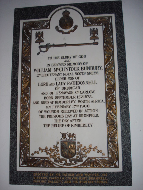 ‘Much regret has been caused in Carlow by the news that the Hon. W. M’Clintock-Bunbury, eldest son of Lord Rathdonnell and grandson of the Right Hon. Henry Bruen, P.C., Oak Park, Carlow, has been killed in South Africa. The young officer was a Lieutenant in the Scots Greys, and lost his life in the engagement at Rensburgh. He was a young man of much promise and idolised by his relatives … In consequence of the death of the Hon W. M’Clintock Bunbury the Carlow Hounds did not hunt this week.’