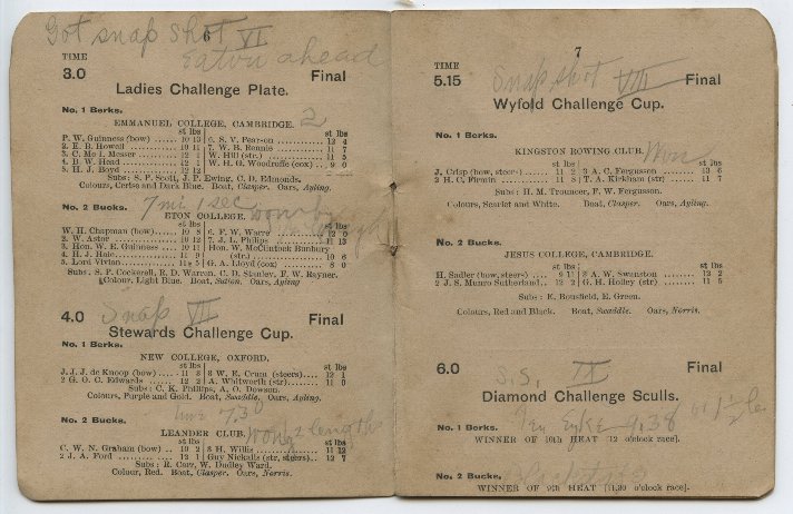 … Final Heat: Station 2 (Eton).—J. L. Phillips and Hon. WMcClintock Bunbury, first. Station 2 (Windsor)—Hon. Guinness and F. Warre, second. Station 1 (Eton)—Lord Vivian and W. H. Chapman, third. Station 1 (Windsor).—P. Cockerell and R. F. Robinson, fourth.