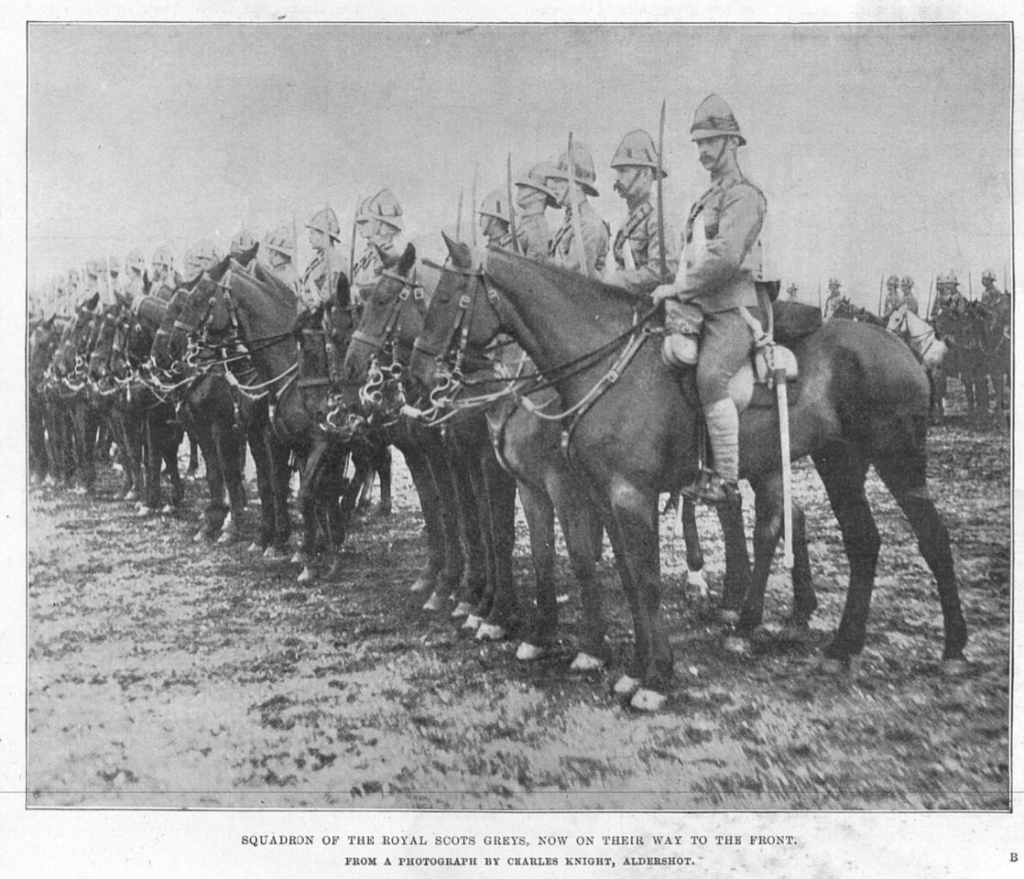 Charles Knight took a photograph of the Royal Scots Greys en route to the front, which was published in The Sketch on 6 December 1899. (See here). Two days later, the press published this update: