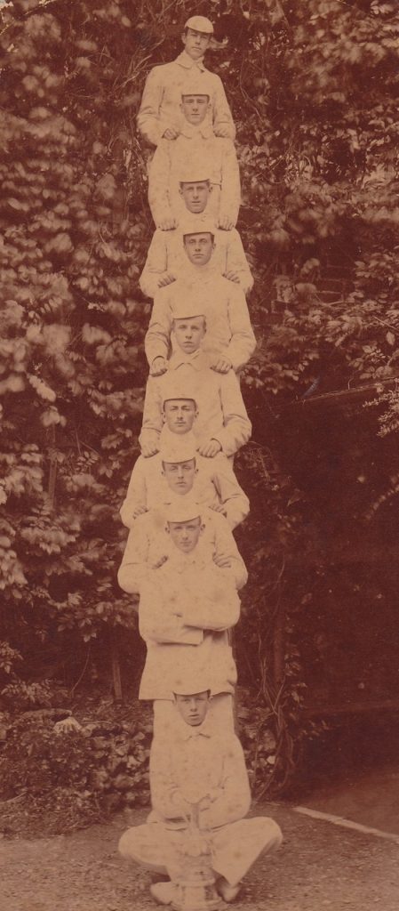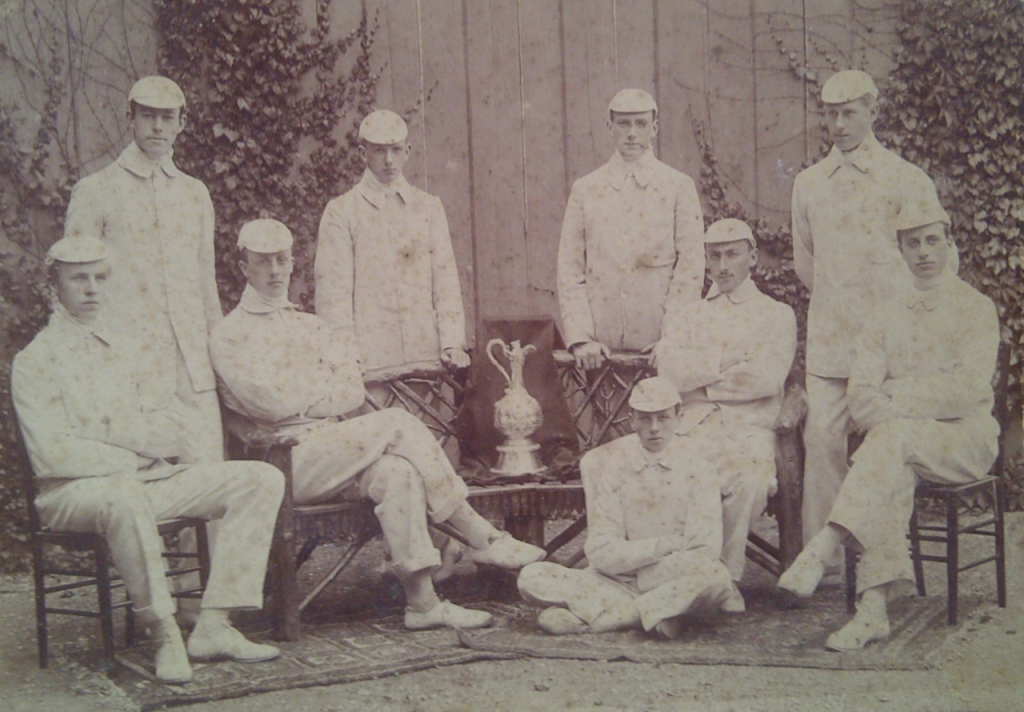 The Eton VIII from 1896 with the Ladies Plate from Henley. Left to right (top row): Hon. M.C.A. Drummond, Hon. W. McClintock Bunbury (stroke), C.M. Black, F.W. Warre, J.L. Philips, W. Dudley Ward, J.A. Tinne, E.L. Warre, R.A. Blyth (Cox).  In another picture they are in the shape of a ladder, almost certainly recreating the positions of the crew when they are in the boat as per the listing in the Windsor and Eton Express of 11 July 1896 above.