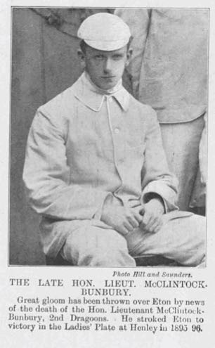 ‘THE LATE HON. LIEUT. McCLINTOCK- BUNBURY. Great gloom has been thrown over Eton by news of the death of the Hon. Lieutenant McClintock- Bunbury, 2nd Dragoons. He stroked Eton to victory in the Ladies’ Plate at Henley in 1895.’