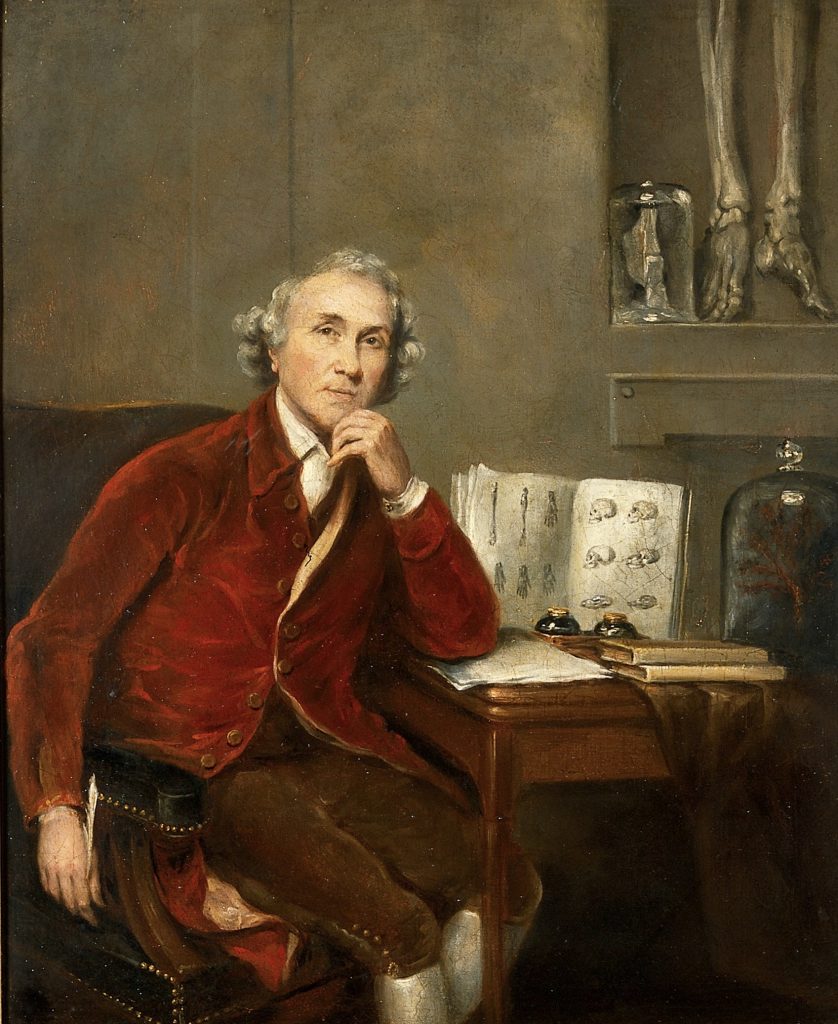 John Hunter (1728-1793), surgeon and anatomist. When Joshua Reynolds’s painted Dr Hunter’s portrait, he included the legs of Byrne’s giant skeleton in the background.