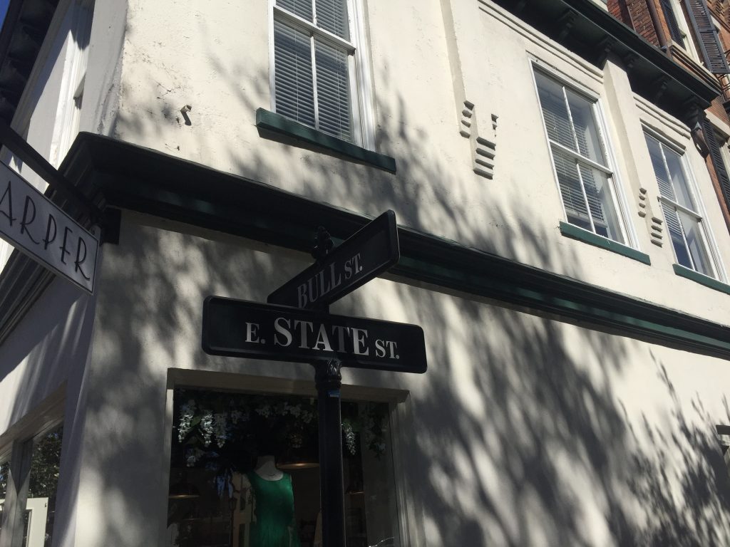 The corner of State and Bull Street, Savannah, where Daniel Robertson’s childhood home stood. (2018)