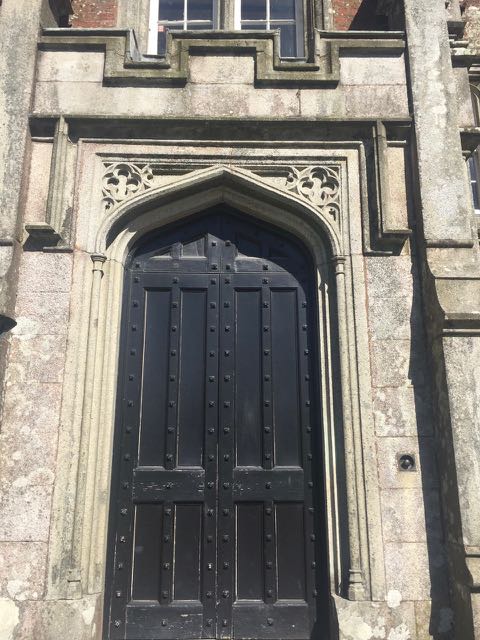 The front entrance to Wells House, Gorey, County Wexford, is remarkably similar to that of the original Lisnavagh. Robertson certainly had a few distinctive traits, a la door surrounds. The Lisnavagh lintel or top is now of course in the library on half of its original uprights; I think it has M and B in the corners of the carving, representing McClintock and Bunbury. The remainder of the side pillars support the plain top in the flat sitting room at Lisnavagh while the doors themselves are now at Kinsellagh’s Hill. In 2016 the timber infill that sat over the doors was placed over the door between the bar and dance floor in the Garden Wing.