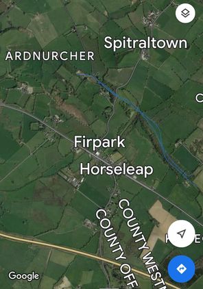 The Horseleap Esker running along the blue line is one of a group of eskers (Moate, Split Hill, Clara, Ballyduff, Kilcormac) that converge eastward in a large fan shape. It is bisected by the R391 road and the Midland Great Western Railway (Clara Branch) line, which closed in 1965. The McGeoghegan clan built a castle atop, now in ruins. There seems to be no surviving pathway. but there is a quarry at Ardnurcher. The Bianconi horse route overlaps some of this. (See here). Thanks to John Casey.