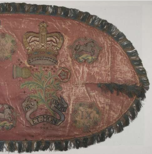 A part of Colonel A. P. Lefroy’s Guidon of the 9th Dragoons. The 9th were ordered to become Light Dragoons in 1783 but Owing to the regiment being in Ireland they were not completely uniformed and equipped as such until 1804. See here.