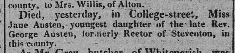 Extract from Hampshire Chronicle, Monday 21 July 1817 referring to the death of Jane Austen.