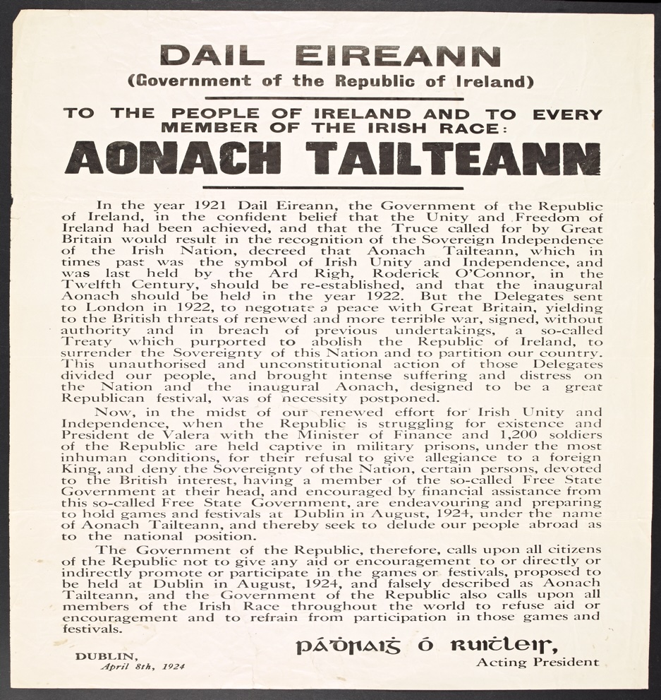 Broadside published in 1924 by the then illegitimate Republican Government discouraging people from attending the inaugural Aonach Tailteann, which was being organised by the (legitimate) Free State Government. Source: National Library of Ireland.