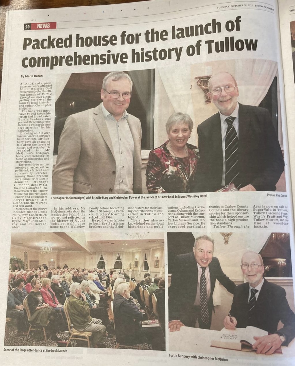 It was my great pleasure to launch Christopher McQuinn’s biblical epic, Tullow Through the Ages, at Mount Wolseley Hotel in Tullow, County Carlow, on 16 October 2025.